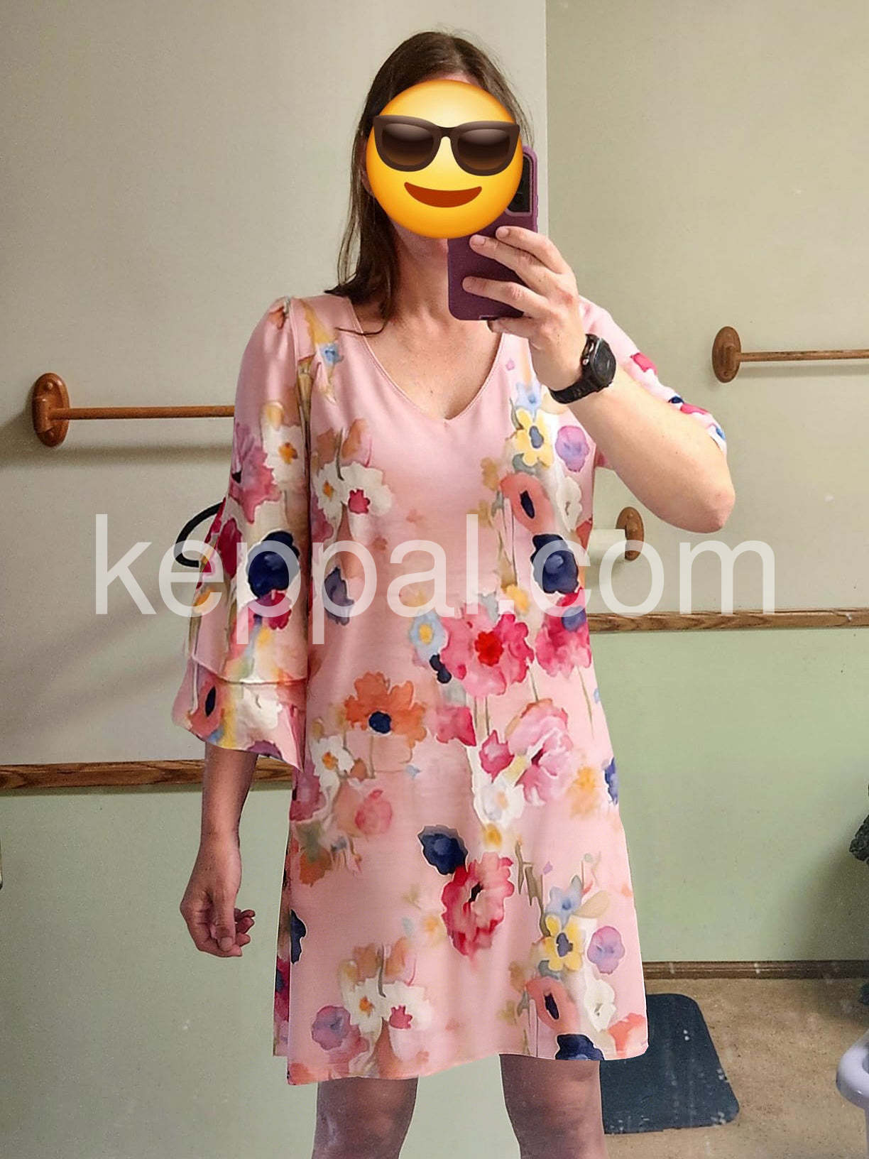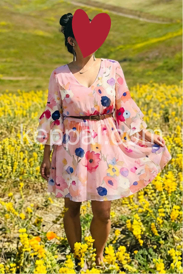 Pink Watercolor Floral 3/4 Sleeve Mini Dress