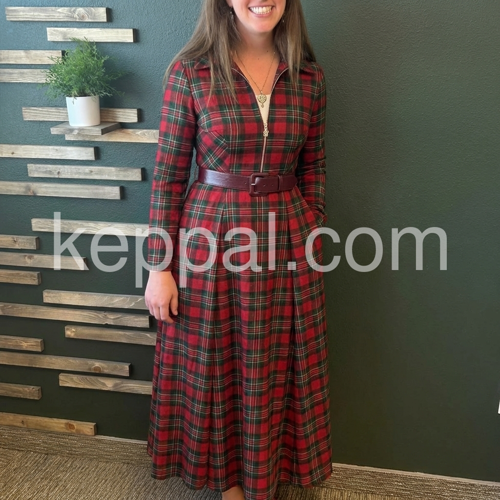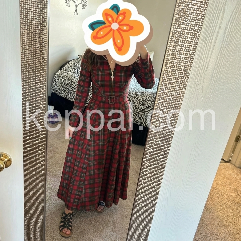 Distinctive Red Plaid Zip Front Long Sleeve Maxi Dress