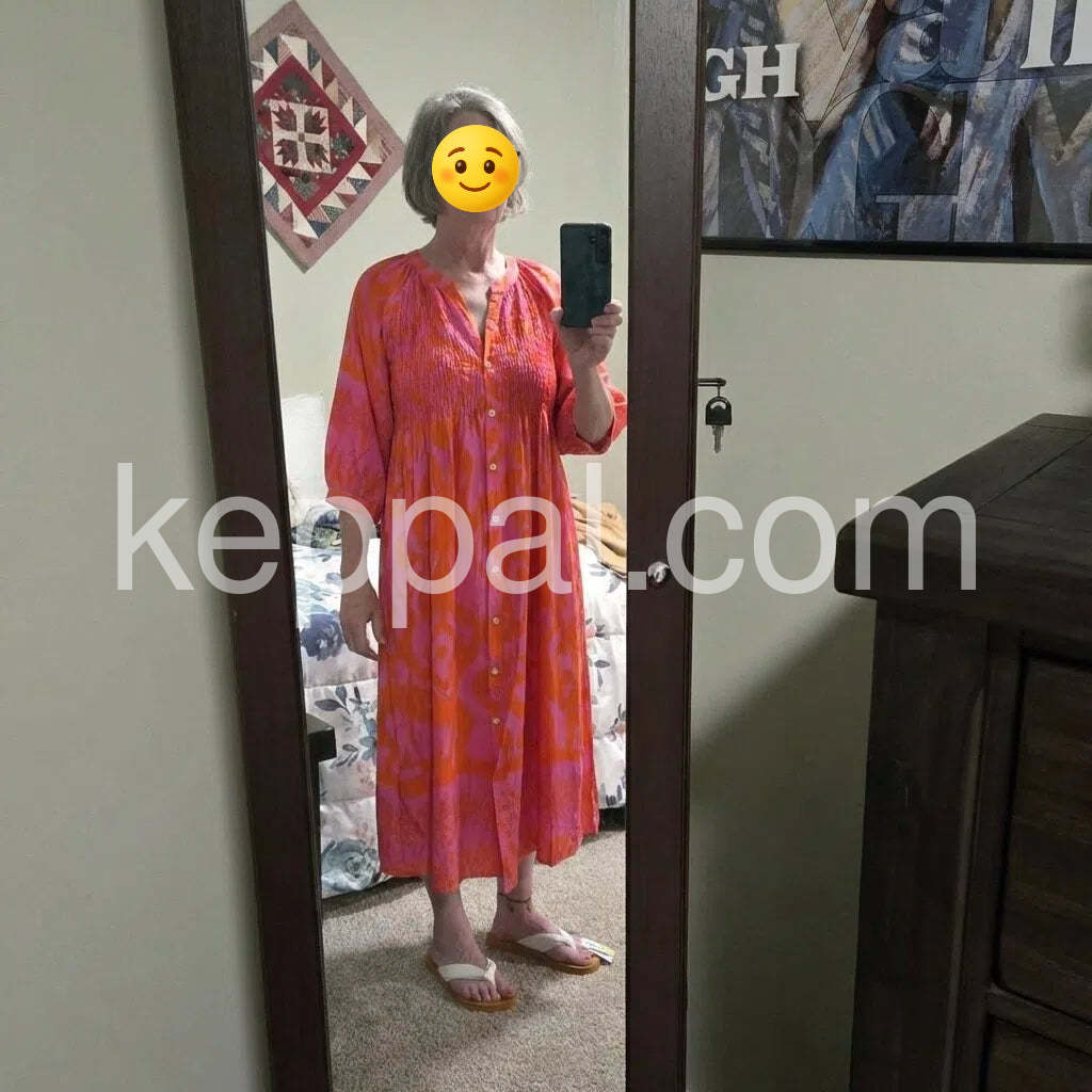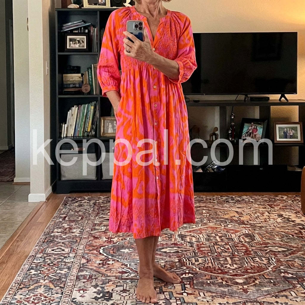 Hot Pink and Orange Print Shirred Button Front Midi Dress